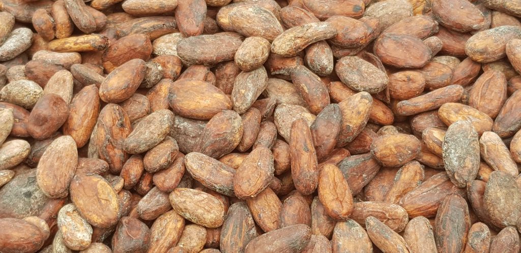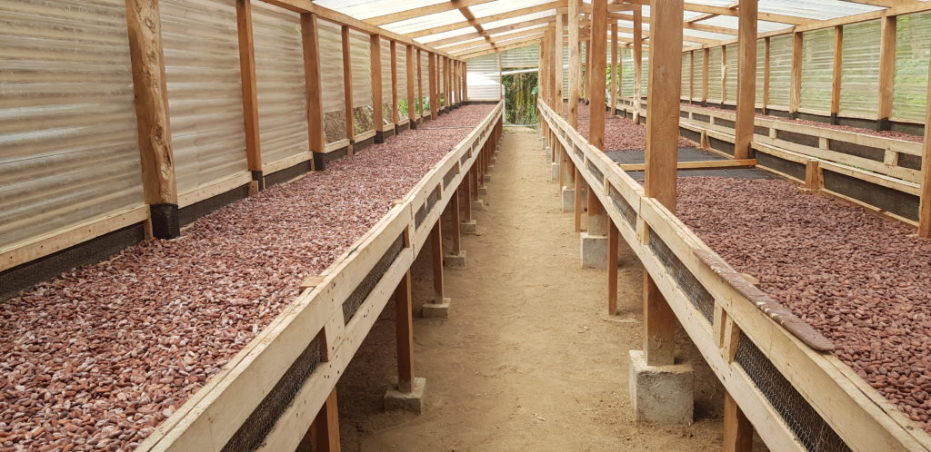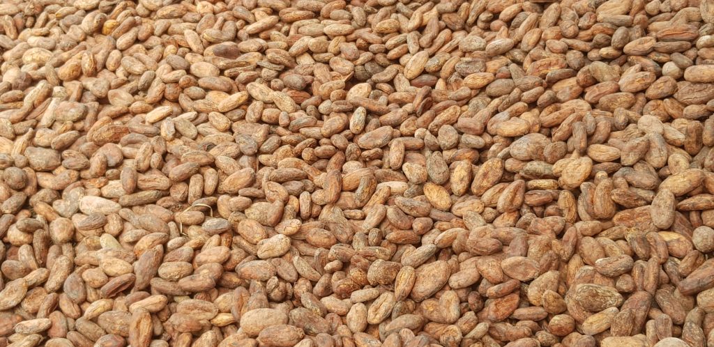 Zum Trocknen der Kakaobohnen liegen diese auf Bahnen zum Trocknen und werden mehrmals täglich umgerührt.