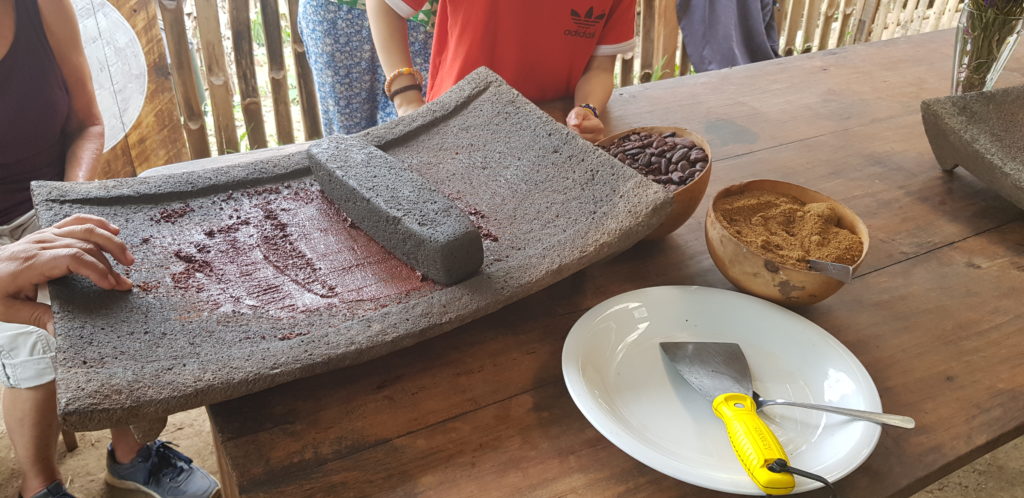 Danach werden die Kakaobohnen auf einem Mahlstein zur Kakaomasse fein gemahlen.